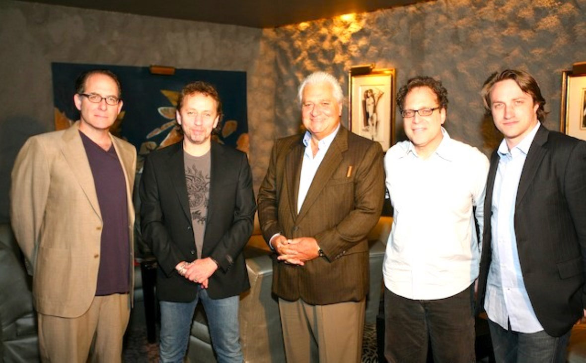 Networking at the very first MUSEXPO back in 2005 are (L-R) Deville Schober (Founder, Brainstorm, Germany), MUSEXPO Founder Sat Bisla, Mike Caren (Founder & CEO, APG), Craig Kallman (Chairman & CEO, Atlantic Records), and Jason Flom (Founder & CEO, Lava Records).