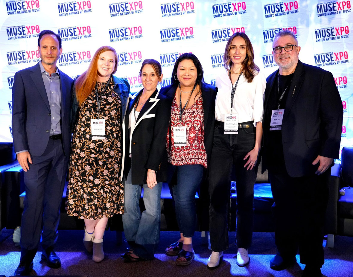 Sharing insights into music integration within some of Hollywood’s biggest global blockbuster films and soundtracks at MUSEXPO 2024 were (L-R) Mike Knobloch (President, Music & Publishing, NBCUniversal), Nikki Walsh (Vice President, Soundtrack & Marketing, Universal Pictures), Rachel Levy (Executive VP, Motion Picture Music, Universal Pictures), Angela Leus (Sr. Vice President, Film Music, Universal Pictures), Natalie Hayden (Sr. Vice President Film Music, Universal Pictures), and Ritch Esra (Publisher, The Music Registry & Co-Founder, MUBU-TV).