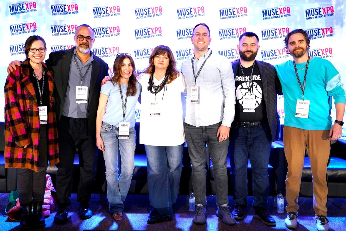 Conversing about the evolution of music licensing, sync, and beyond at MUSEXPO 2024 were (L-R): Alicen Schneider (former Head of TV Music, NBCUniversal), Peymon Maskan (Founder, Radish Music Supervision), Jennifer Pyken (Music Supervisor), Selena Arizanovic (Director, Programming Music, FOX Entertainment Music), Ryan Svendsen (Head of Music, Angel Studios), Andrew Brady (Sr. Manager, Creative Music Strategy, Paramount Global), and John McGrew (Music Creative, Netflix Animation Series).