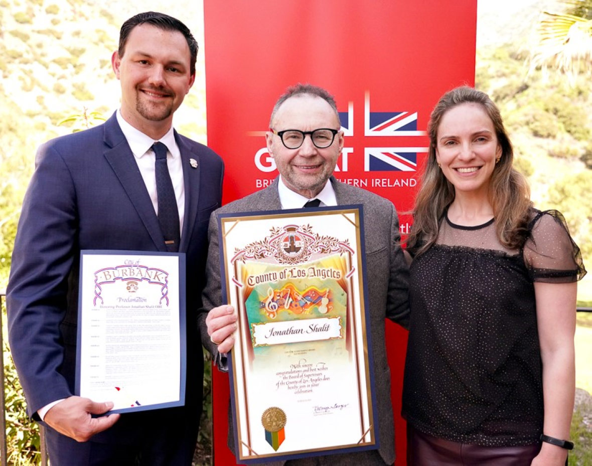 Presenting official proclamations for Professor Jonathan Shalit OBE’s “Lifetime Achievement Award” at MUSEXPO 2024 are Nick Schultz, Mayor of Burbank (pictured left) and Emily Cloke, British Consul General, Los Angeles (pictured right).