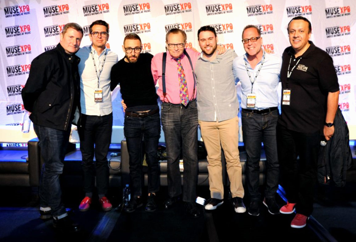 Pictured (L-R) are Ben Cooper (former BBC Radio 1 Controller), Matt Pincus (Co-Founder & CEO, MUSIC), Nick Raphael (Co-Founder, NWS Music Group), the late Larry King (CNN), Scooter Braun (CEO, HYBE America), Steve Schnur (Worldwide Executive & President of Music, Electronic Arts), and Sat Bisla (President & Founder, A&R Worldwide / MUSEXPO).