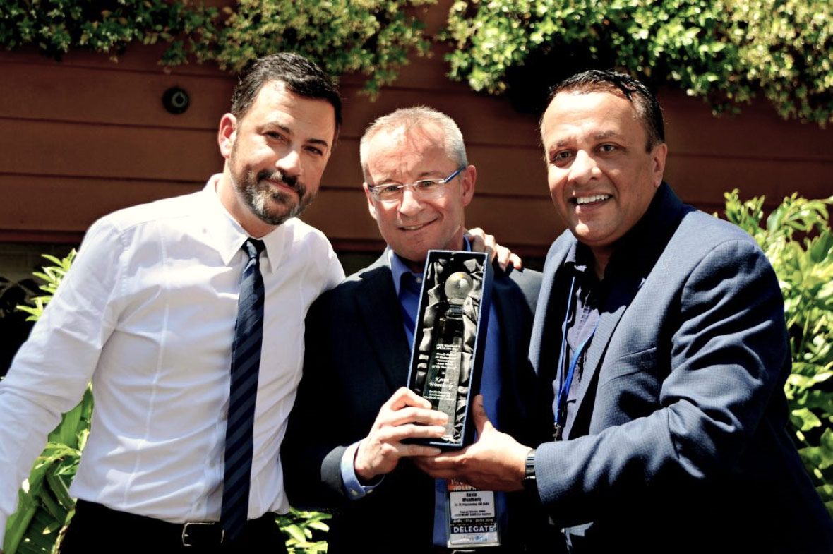 Presenting the 2016 “International Music Person of the Year” award to Kevin Weatherly (Sr. Vice President Programming, KROQ Los Angeles) are Jimmy Kimmel (Host, Jimmy Kimmel Live, ABC Television) and MUSEXPO Founder Sat Bisla.